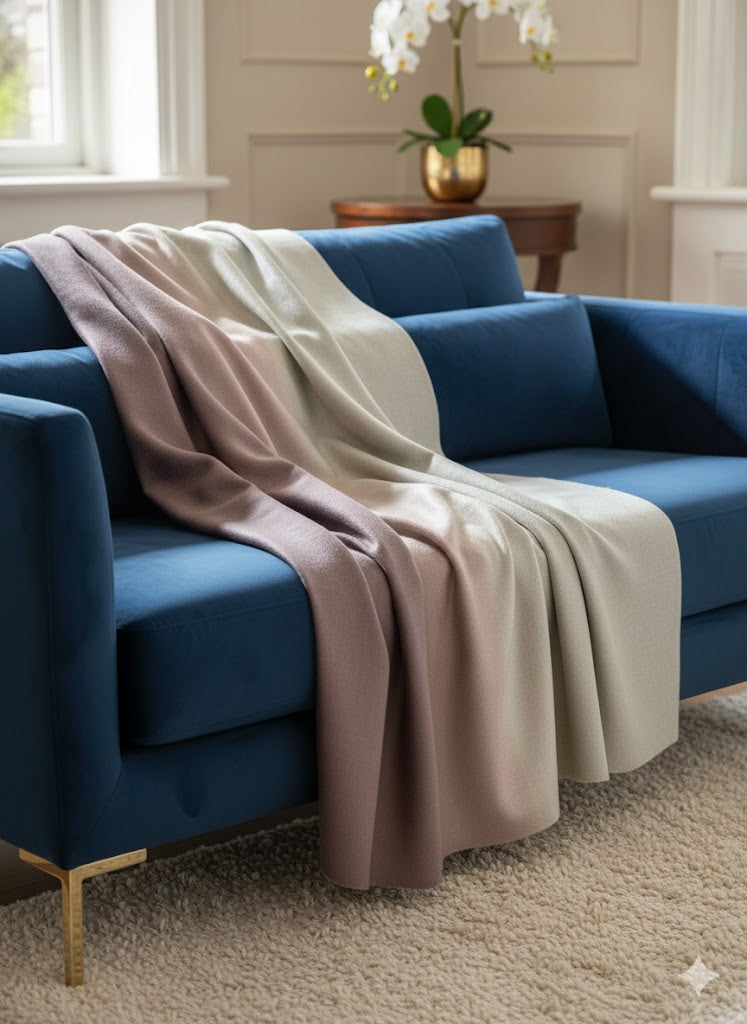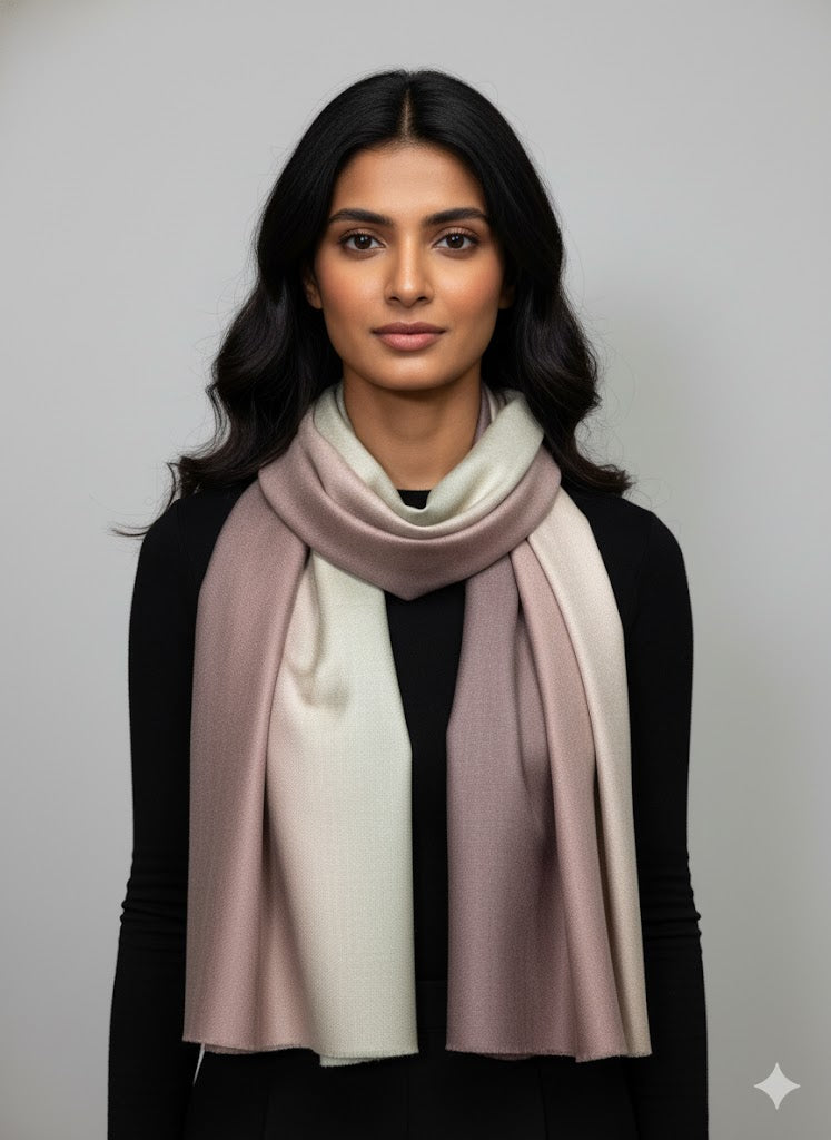 Design: A timeless ombre pattern where the two neutral colors seamlessly melt into each other. The edges appear to be finished with a clean, un-fringed look (or minimally fringed), enhancing its polished feel.