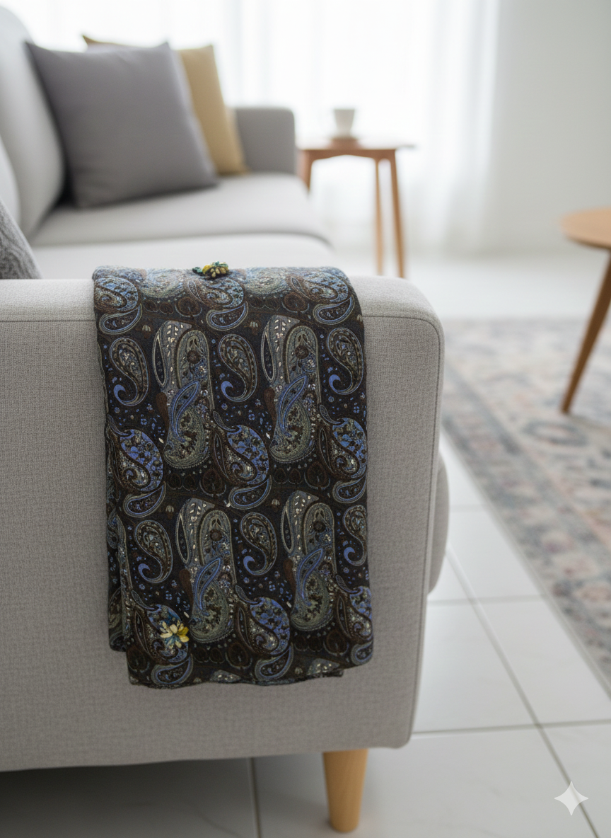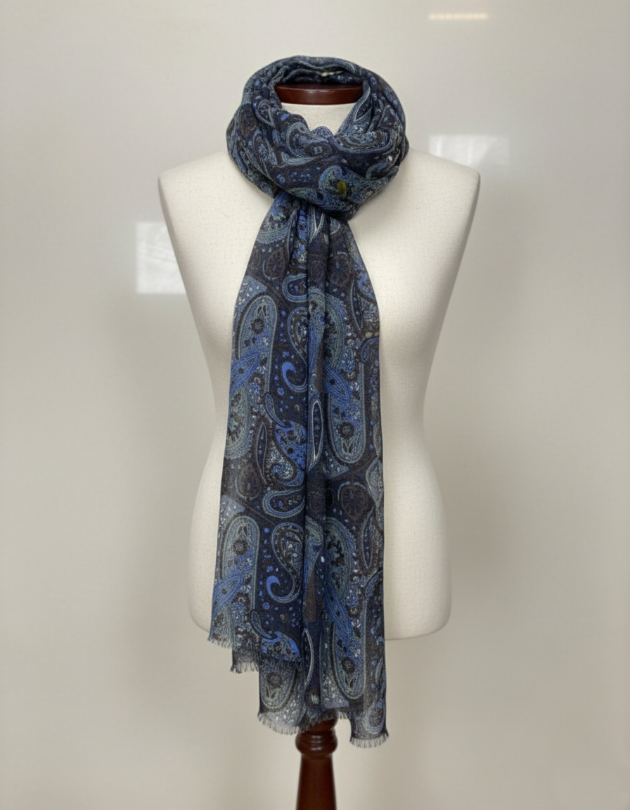 Add sophistication to your winter style with this elegant Blue Wool Embroidered Scarf, designed with a classic paisley print in shades of blue, grey, and black. The delicate hand embroidery enhances its luxurious texture, making it a statement piece for any outfit.