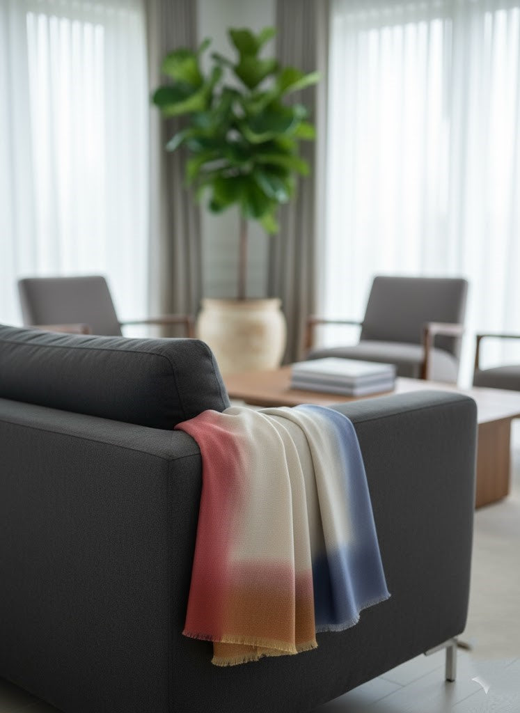 This fine-quality, square/rectangular shawl offers a modern take on the Ombre technique, featuring color shading along the borders for a refined, artistic look.