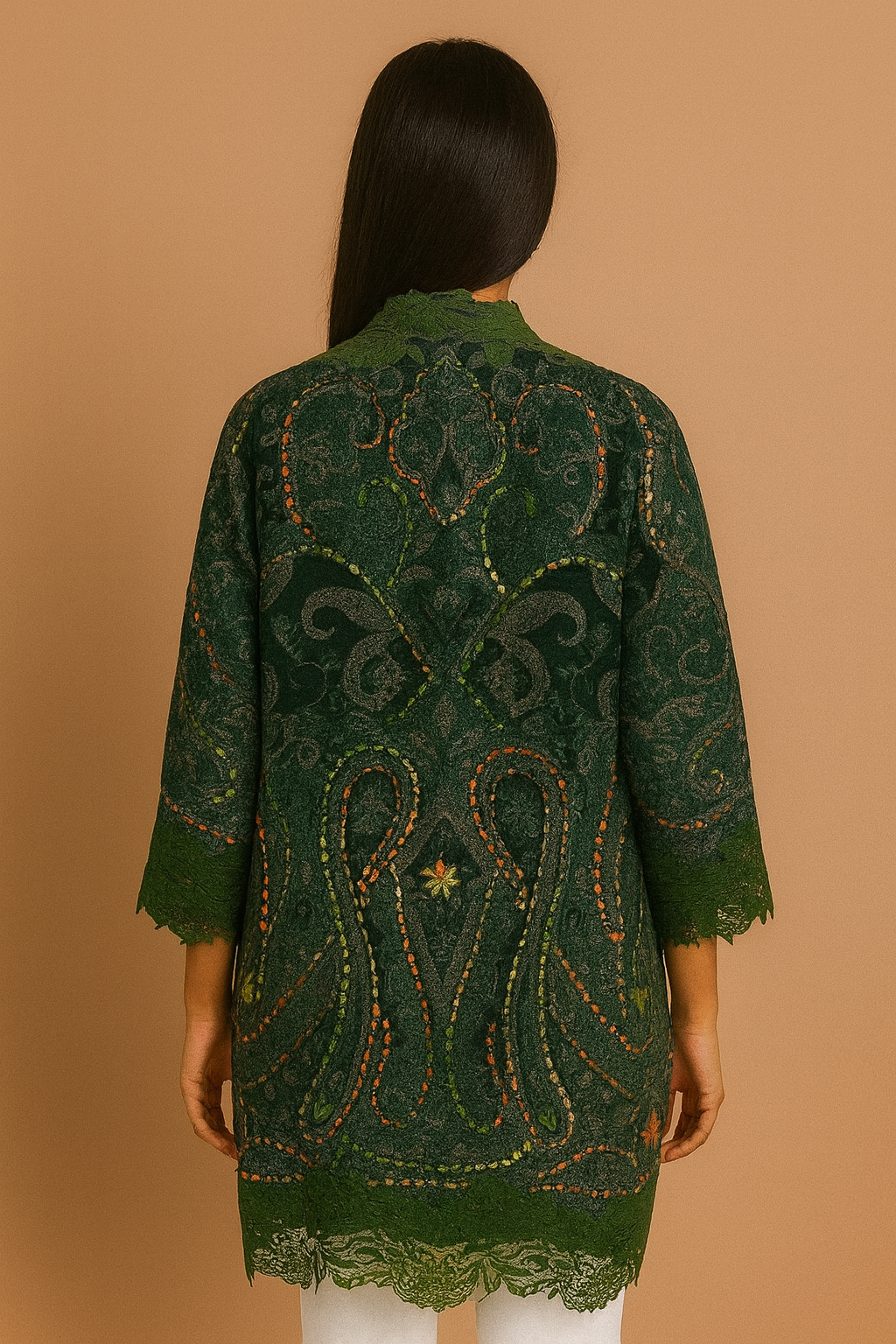 Elevate your winter wardrobe with this beautifully crafted Green Wool Embroidery Lace Jacket, designed to blend traditional artistry with modern elegance. The jacket features a soft wool base adorned with rich paisley embroidery, enhanced by delicate red floral lace work along the neckline, front opening, sleeves, and hem.