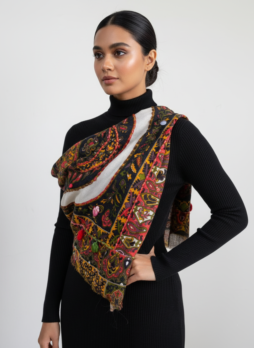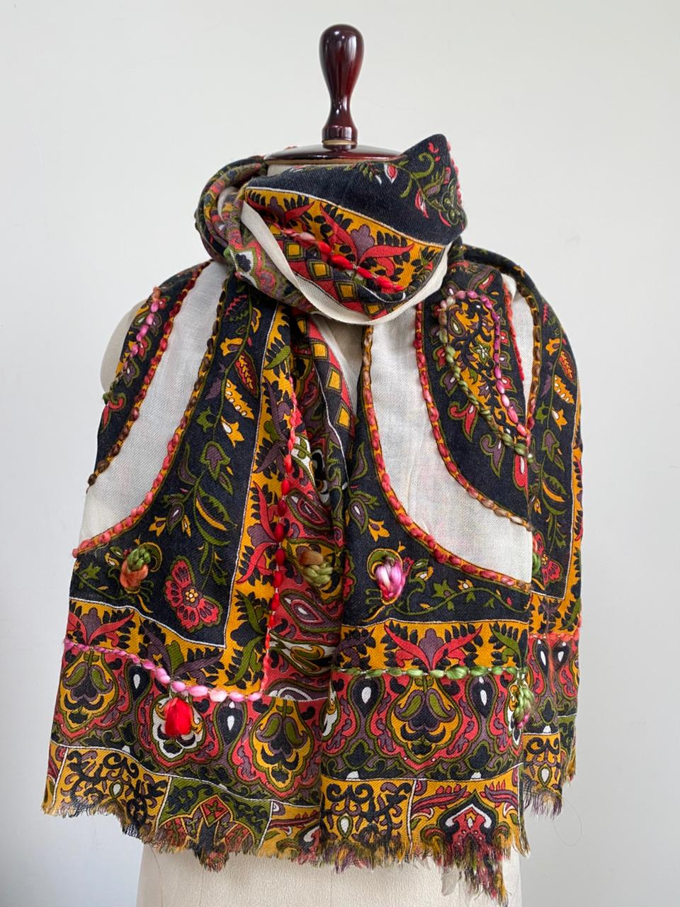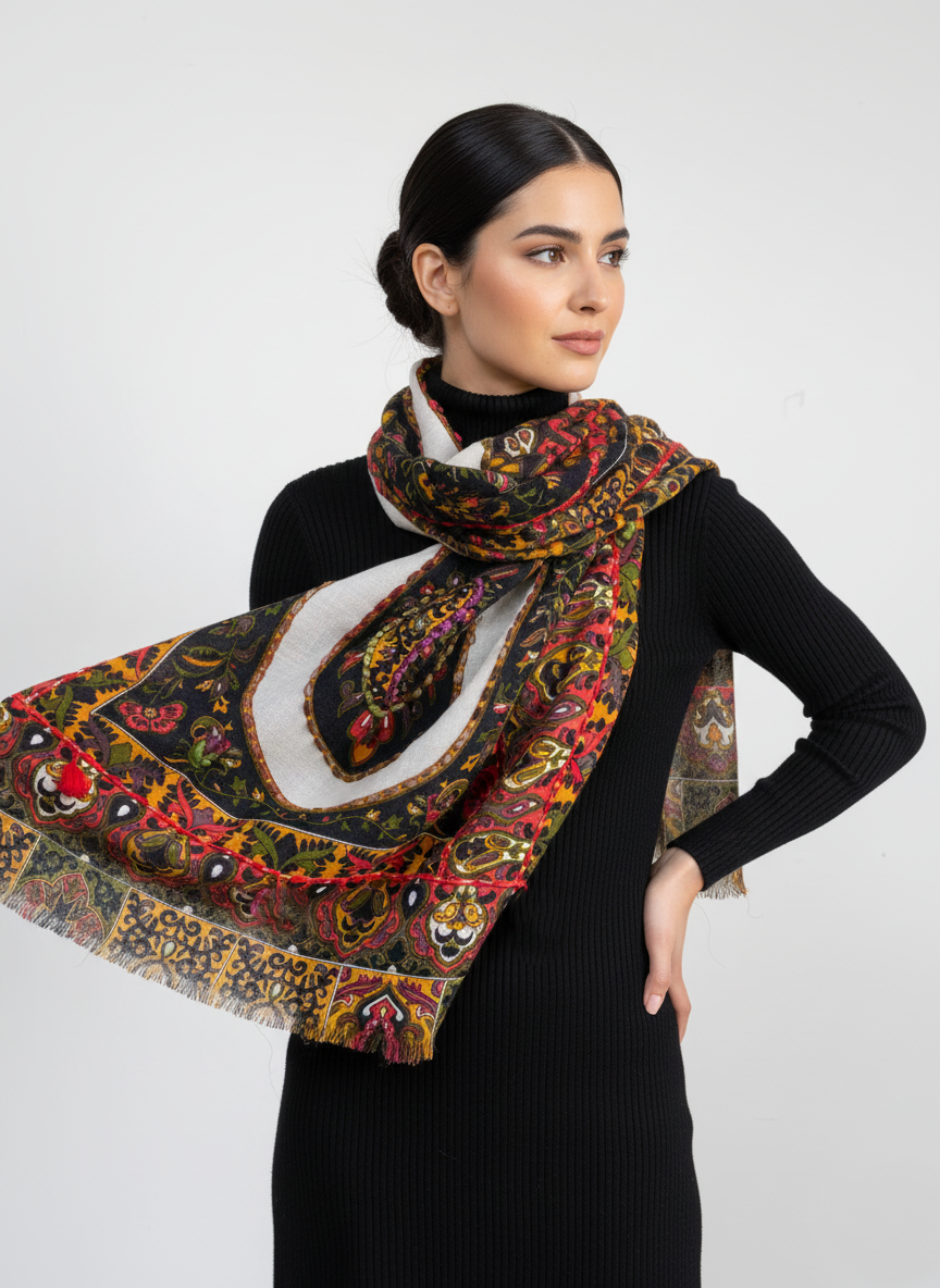 Wrap yourself in timeless elegance with this exquisite Wool Embroidered Printed Scarf. Featuring a rich Kashmiri-inspired floral and paisley design, this scarf beautifully blends traditional artistry with modern charm. The intricate hand embroidery details add a luxurious touch to the vibrant multicolor print — showcasing shades of black, mustard, green, and red.
