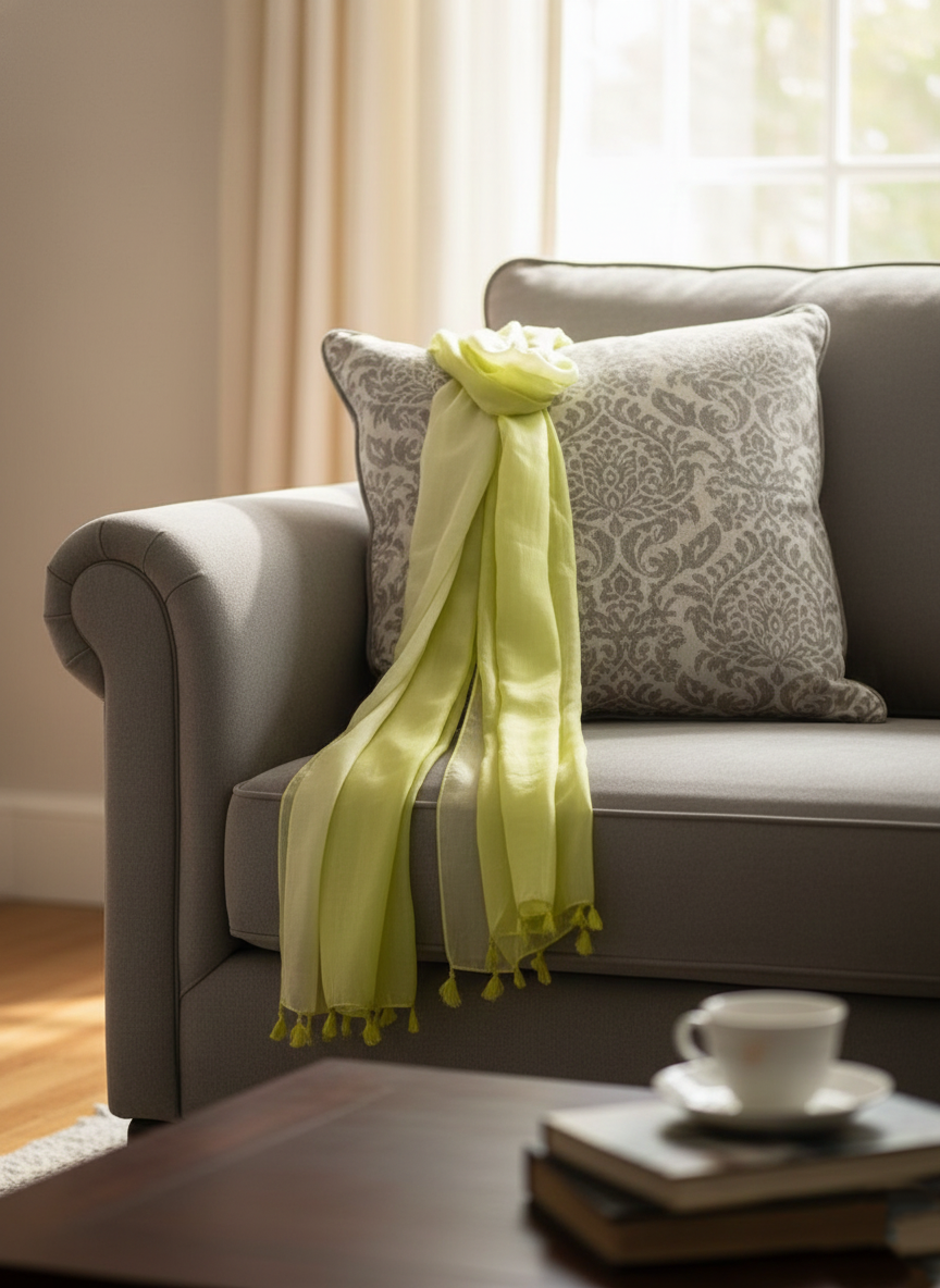 Add a refreshing pop of colour to your wardrobe with this elegant lime green viscose scarf. Crafted from lightweight, breathable fabric, it drapes smoothly and feels soft against the skin. The subtle sheen enhances its premium look, while the delicate tassel edges add a touch of charm. Perfect for daily wear, office styling, casual outings, or pairing with ethnic and western outfits for a bright, effortlessly chic finish.