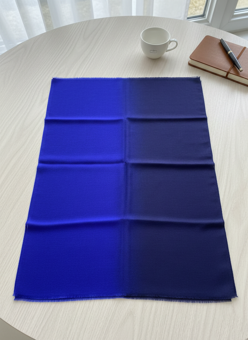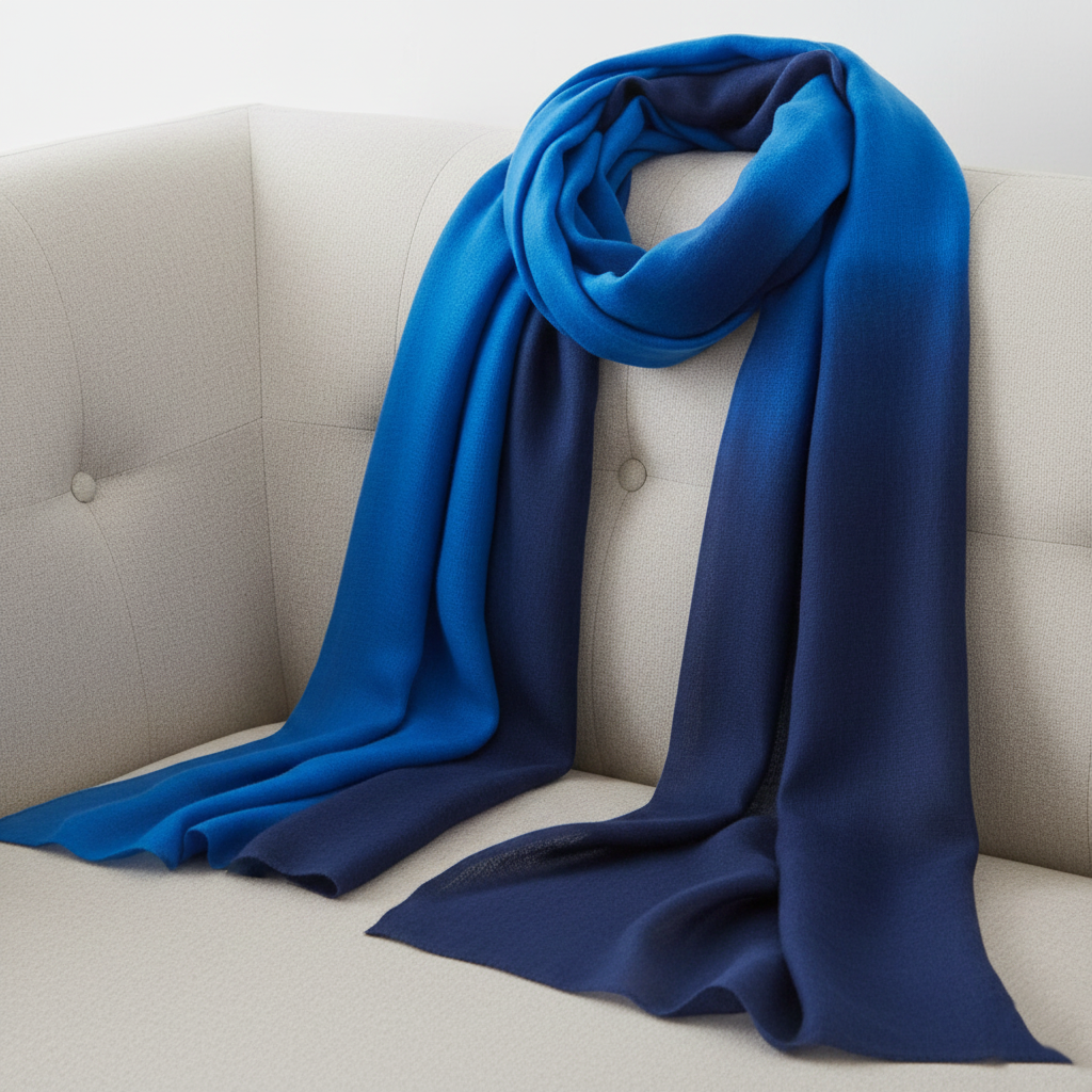 Design: The striking ombre pattern is achieved through meticulous dip-dyeing, ensuring a smooth and captivating blend where the light blue seamlessly fades into the dark blue. It features natural fringed edges (as seen in the image)
