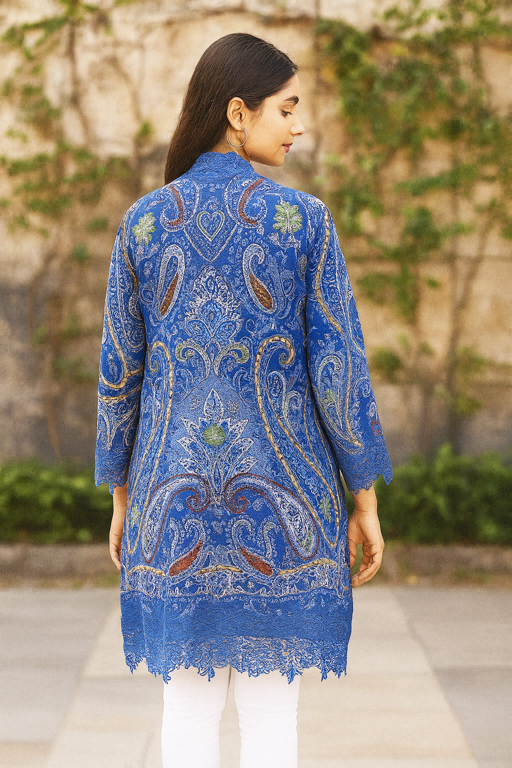 Elevate your style with this elegant Bright/Royal Blue Wool Embroidery Lace Jacket, beautifully designed with a blend of comfort, craftsmanship, and timeless charm. The soft woollen fabric features an all-over floral embroidered pattern in subtle tones, giving it a classic yet refreshing appeal.