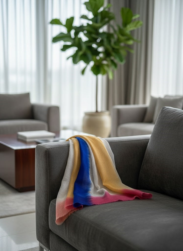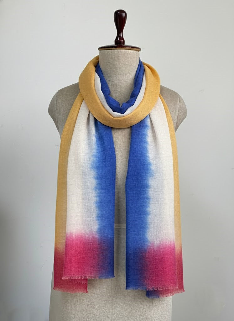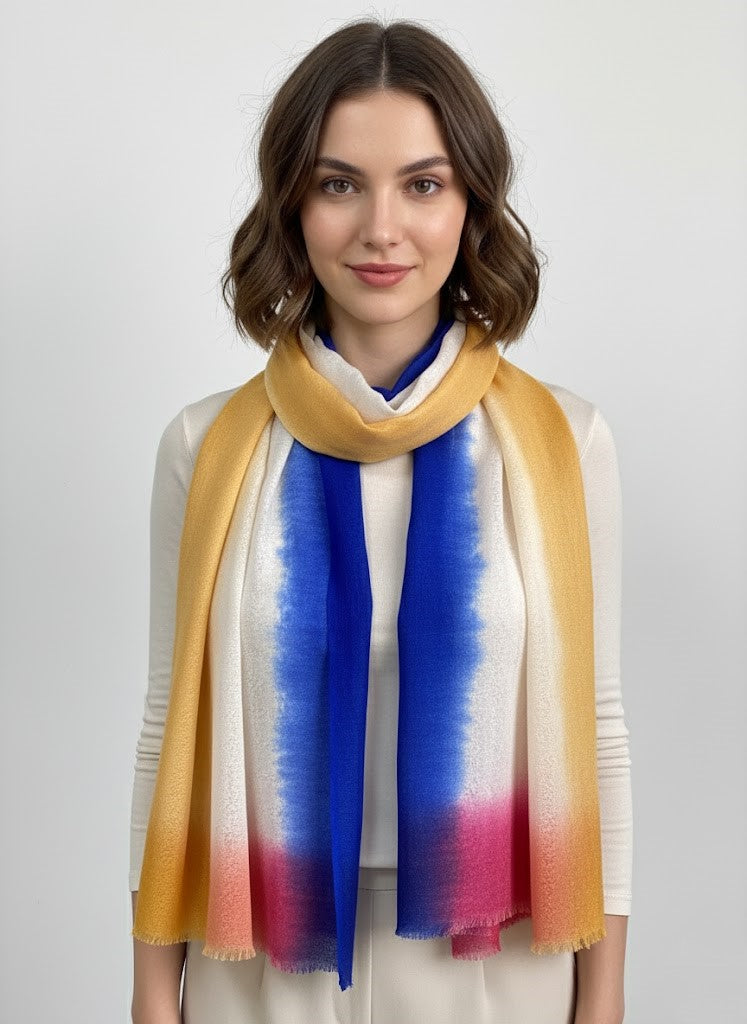 Elegant Tri-Color Ombre Wool Scarf – Blue, Yellow & Maroon Gradientby Cashmere Craft
