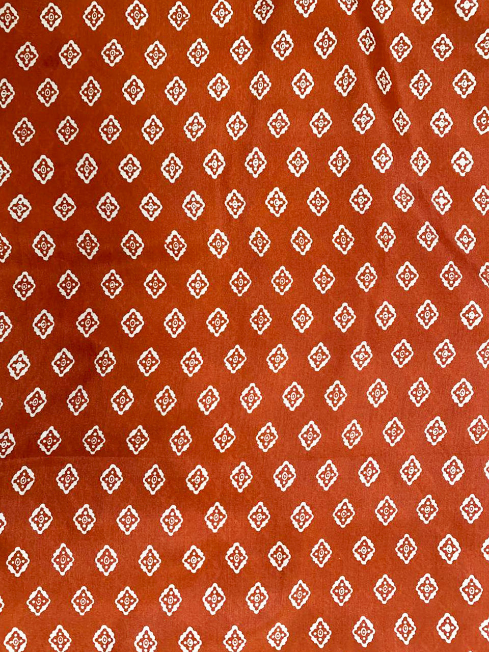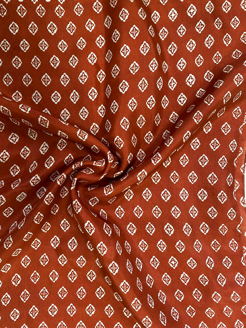 Elevate your everyday look with this stunning Terracotta Red scarf. Featuring intricate off-white geometric motifs that resemble traditional Ikat or Bandhani tie-dye patterns, this piece adds a timeless, earthy elegance to any outfit.