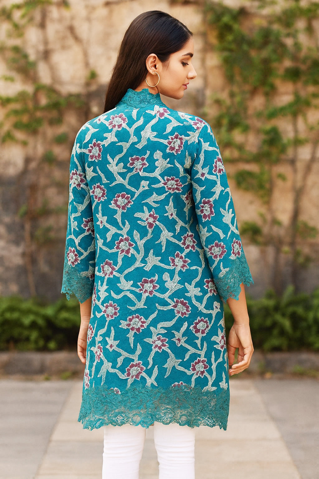 Elevate your style with this elegant Turquoise/Teal Blue Wool Embroidery Lace Jacket, beautifully designed with a blend of comfort, craftsmanship, and timeless charm. The soft woollen fabric features an all-over floral embroidered pattern in subtle tones, giving it a classic yet refreshing appeal.