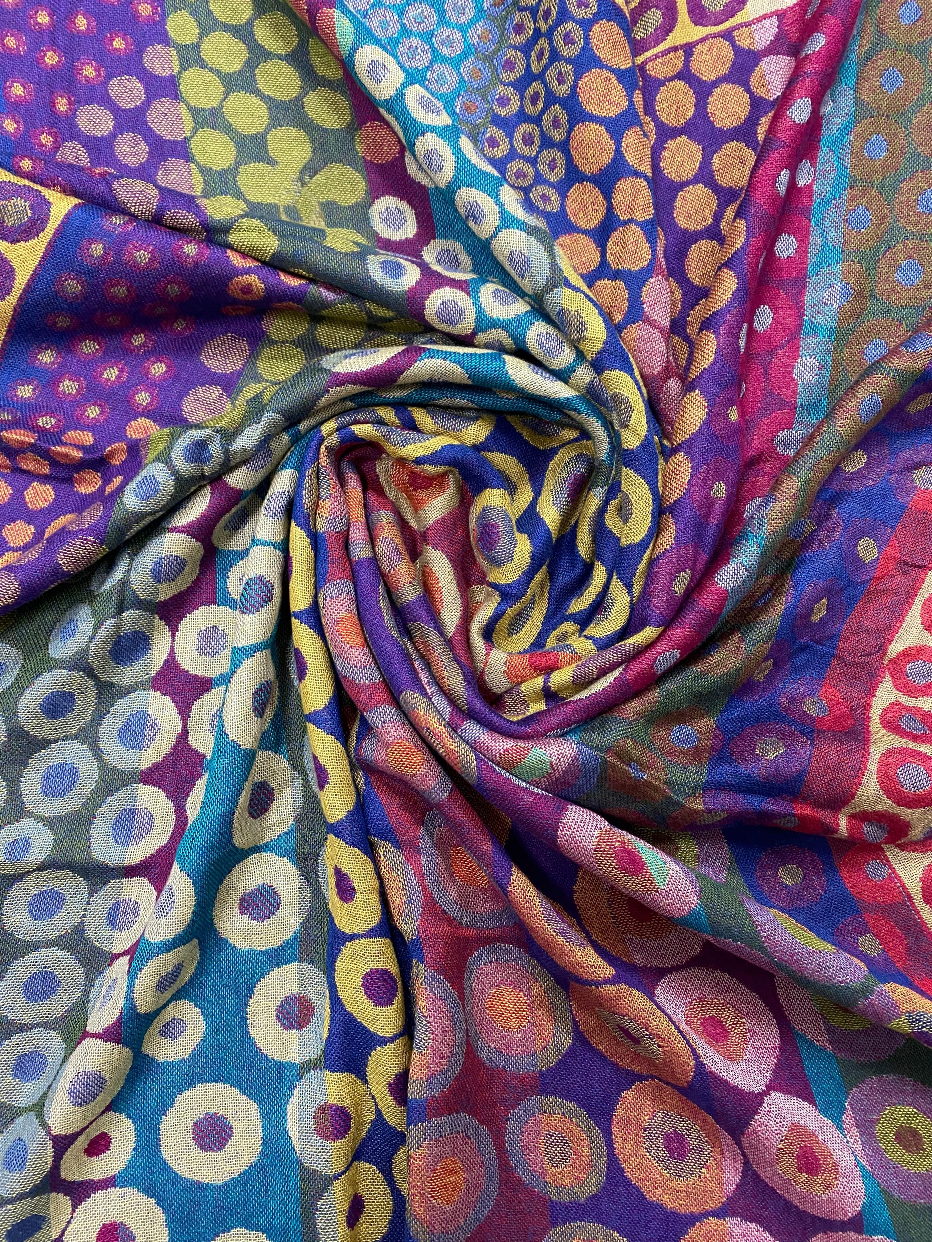 The main attraction is its unique, abstract design, which features patterns of rings and dots arranged in a striking, energetic formation, resembling a colorful burst or radial explosion. The color layering creates depth and movement, giving the stole an almost 3D, psychedelic effect.
